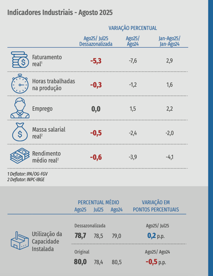 Os Indicadores Industriais apontam retração na maioria dos resultados em agosto de 2025. Após sinalizar perda de ritmo ao longo do primeiro semestre, o setor registrou queda em quase todos os indicadores na passagem de julho para agosto — com exceção do emprego, que manteve estabilidade pelo quarto mês consecutivo, e da utilização da capacidade instalada, que apresentou leve crescimento.
