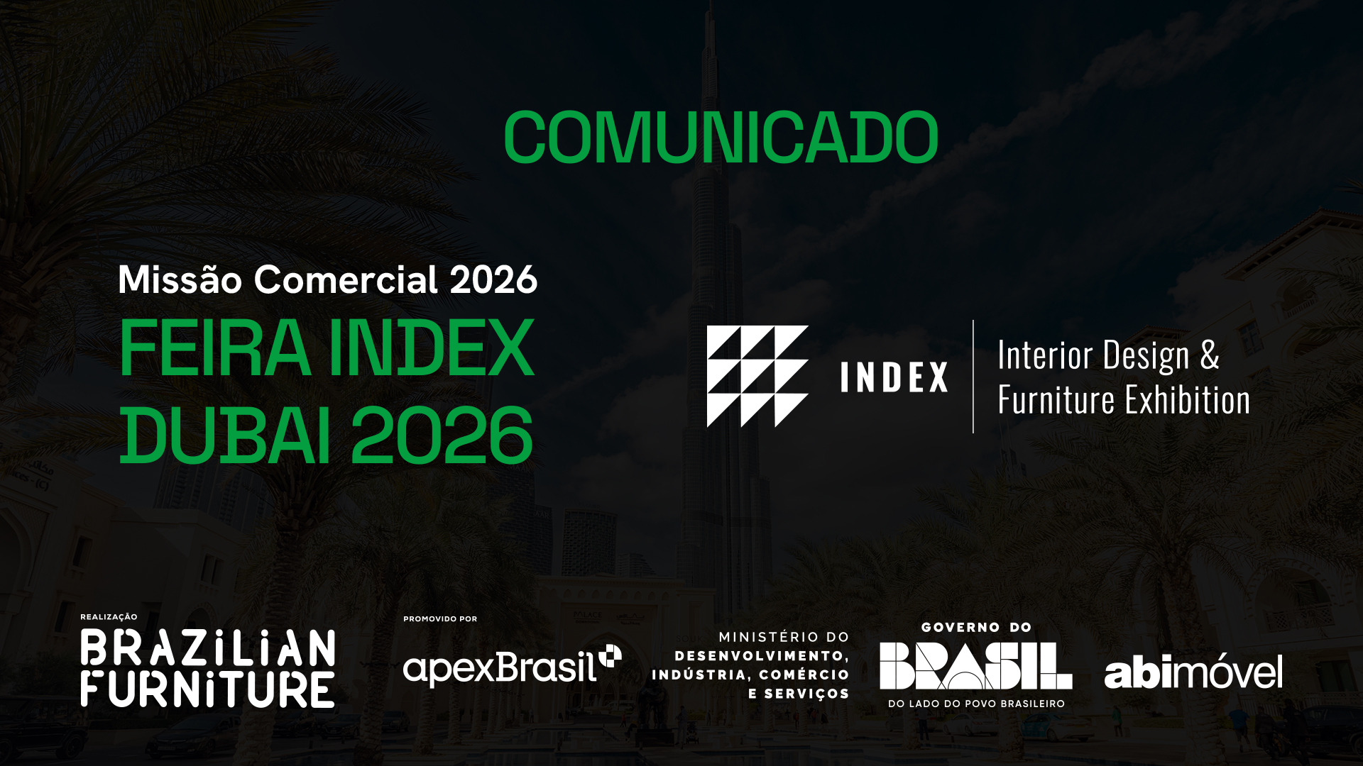 Through the Brazilian Furniture Project, ABIMÓVEL, in partnership with ApexBrasil, informs that Index Dubai 2026 has been postponed to September 28–30 due to the current situation in the Middle East.