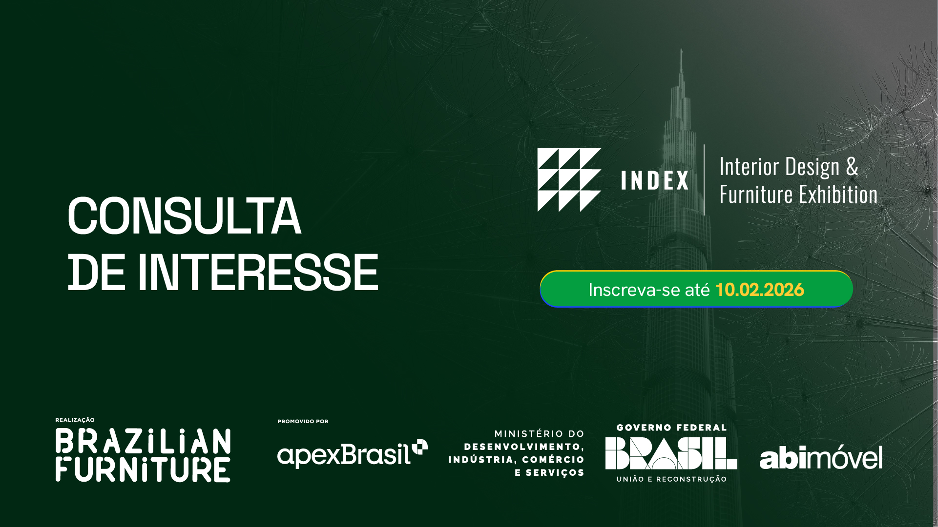 A ABIMÓVEL (Associação Brasileira das Indústrias do Mobiliário), em parceria com a ApexBrasil (Agência Brasileira de Promoção de Exportações e Investimentos), divulgam por meio do Projeto Setorial Brazilian Furniture, a Consulta de Interesse para participação de indústrias brasileiras de móveis na Feira e Missão Comercial Index Dubai 2026. O evento será realizado entre os dias 02 e 04 de junho, nos Emirados Árabes Unidos.