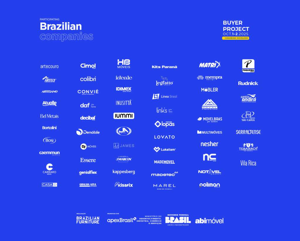 In its 2025–2026 cycle, the project operates through two complementary verticals. The first focuses on finished furniture, bringing together manufacturers and designers that represent the originality, quality, and identity of Brazilian furniture. The second focuses on industry suppliers, including companies producing components, machinery, inputs, and technologies, positioning Brazil as a comprehensive solutions partner for the global furniture industry — from raw materials to the finished product.