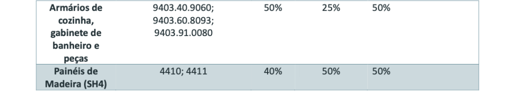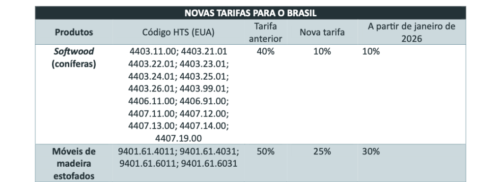 Vale ressaltar que todos os produtos do capítulo 44 (Madeira e seus derivados) foram excluídos do Anexo II da Ordem Executiva 14257, que define a lista de isenções das tarifas recíprocas (10%). No caso brasileiro, os produtos do capítulo 44 terão as tarifas elevadas de 40% para 50%, com exceção de produtos softwood, cuja tarifa foi fixada em 10% para o mundo todo.