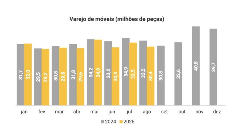 Enquanto isso, fatores macroeconômicos pressionam também o consumo de bens duráveis no país. O varejo de móveis registrou queda de 6,5% em volume de vendas e recuo de 6,0% em receita em agosto. Demonstrando, assim, um comportamento mais contido das famílias diante do crédito caro e da aproximação do fim de ano.