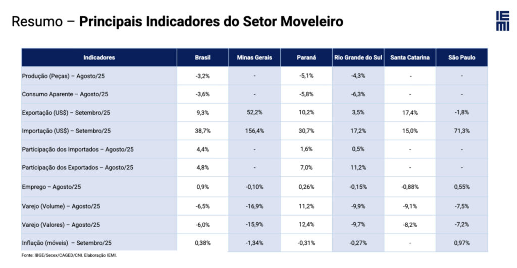 No cenário interno, a indústria brasileira segue marcada por atividade moderada, estoques elevados e demanda mais fraca do que o esperado, conforme revelou o Informativo ABIMÓVEL desta semana. A produção geral no país avançou apenas 0,6% em agosto, acumulando +0,3% no ano e +1,7% em 12 meses. Números que apontam crescimento modesto em um ambiente ainda pressionado por juros altos, crédito restrito e custos produtivos elevados.
