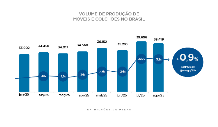 Com isso, o volume produzido de móveis e colchões em 2025 segue em trajetória de desaceleração pelo segundo mês consecutivo, com o acumulado do ano caindo de +1,8% até julho para +0,9% até agosto. Em 12 meses, o desempenho foi de +4,3%.