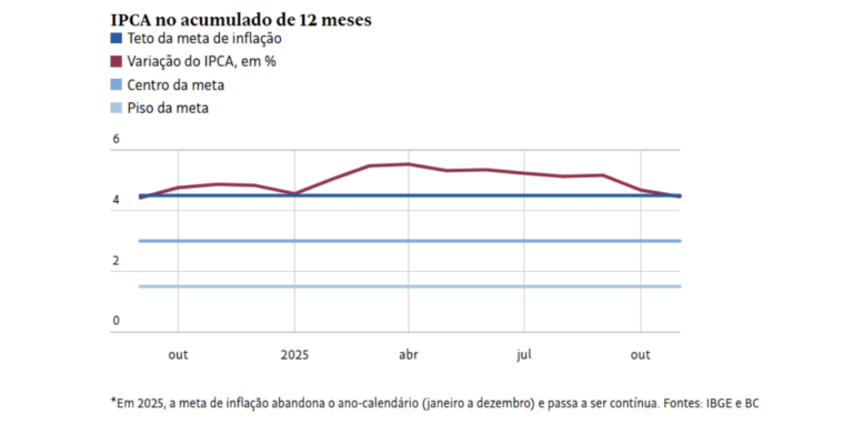 Assim, o índice voltou a ficar abaixo do teto de 4,5% da meta perseguida pelo BC (Banco Central) em 12 meses, o que não acontecia desde setembro de 2024. A alta acumulada era de 4,68% até o último mês de outubro.